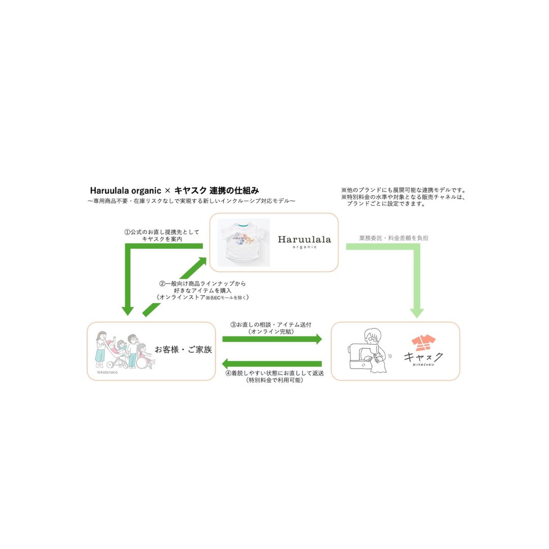 今回の提携により、障害や病気などで服の着脱に不自由がある方々も、購入後にキヤスクでお直しができることを前提に、Haruulala organicさんの商品を選びやすくなります。